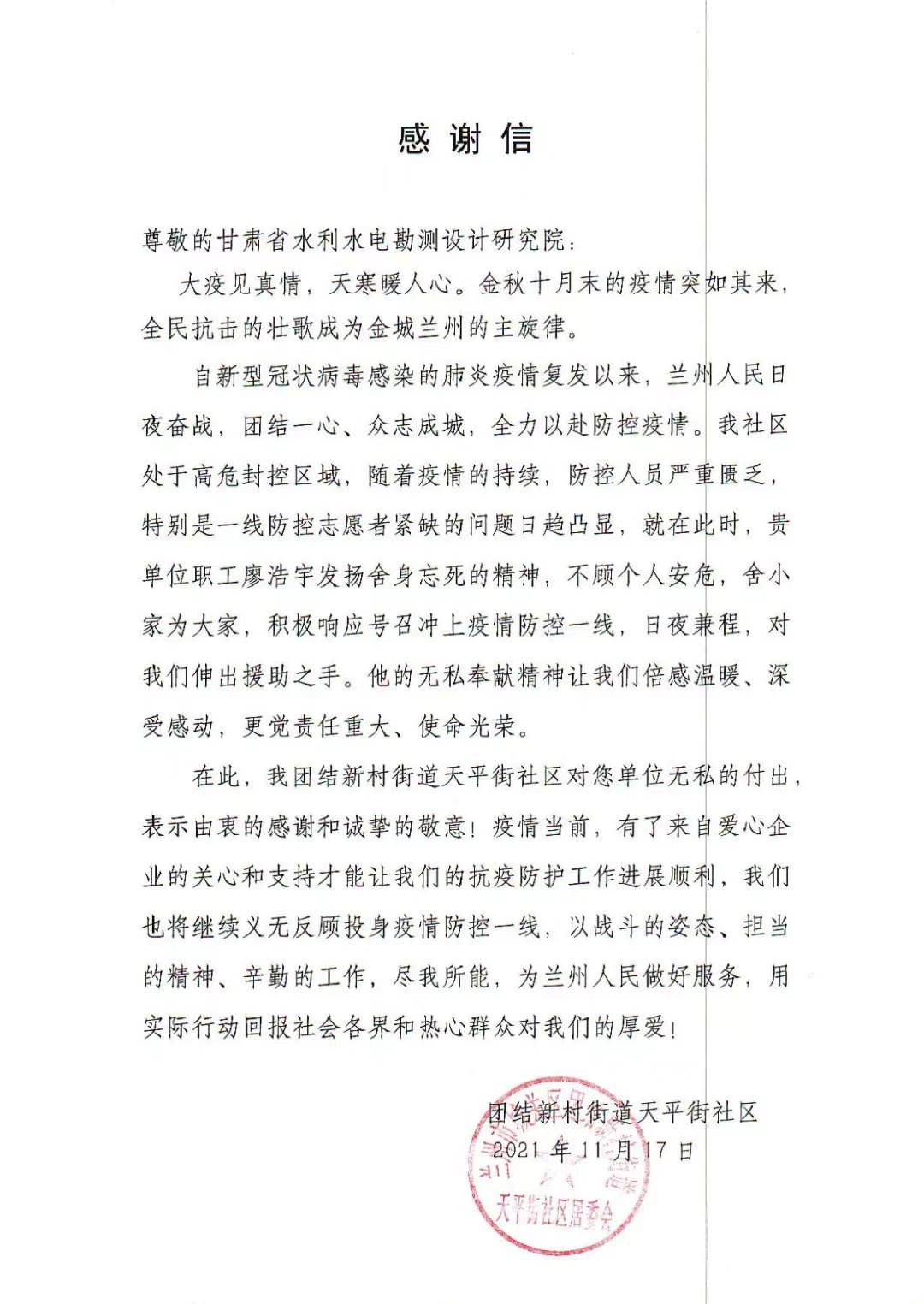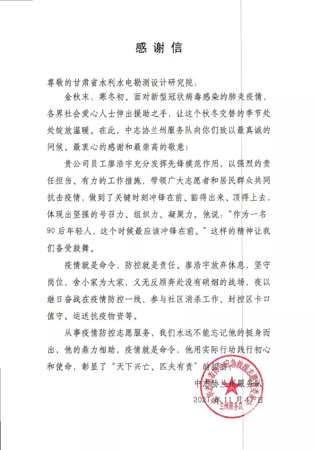 近日,水電設計院收到中志協蘭州服務隊和團結新村街道天平街社區發來的感謝信。信中對水電設計院規劃院員工廖浩宇在此次疫情發生后,主動請纓參加疫情防控服務工作,甘當疫情防控最美逆行者,持續堅持26天志愿者服務的先進事跡表示感謝。