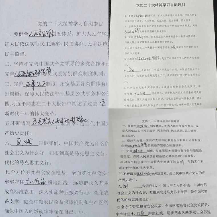 開展答卷測試,檢驗學(xué)習(xí)成效。招標(biāo)咨詢集團(tuán)第三黨支部所屬咨詢中心采取線上視頻會議的方式組織全體黨員居家學(xué)習(xí)黨的二十大報告原文,通過學(xué)原文、悟原理、反復(fù)學(xué)、時常悟,深刻領(lǐng)會和準(zhǔn)確把握報告的精神實質(zhì)、豐富內(nèi)涵和核心要義。同時,對黨的二十大報告相關(guān)知識開展應(yīng)知應(yīng)會測試,通過答卷的方式檢驗黨員干部對黨的二十大精神的理解和把握,達(dá)到以考促學(xué)、以學(xué)促用、學(xué)用結(jié)合、知行合一的目的。