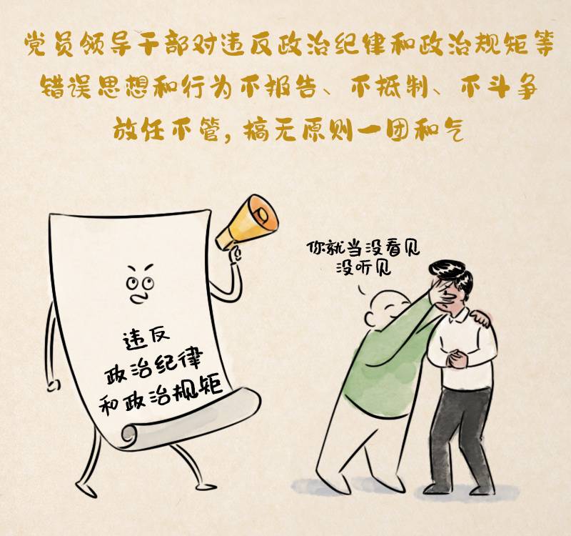 第七十五條 黨員領導干部對違反政治紀律和政治規矩等錯誤思想和行為不報告、不抵制、不斗爭,放任不管,搞無原則一團和氣,造成不良影響的,給予警告或者嚴重警告處分;情節嚴重的,給予撤銷黨內職務或者留黨察看處分。