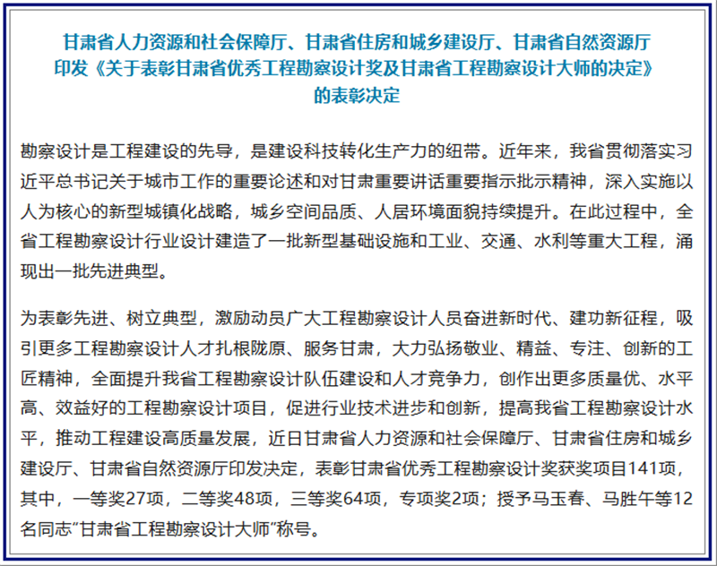 7.甘肅工程咨詢(xún)集團(tuán)斬獲多項(xiàng)勘察設(shè)計(jì)獎(jiǎng)項(xiàng)