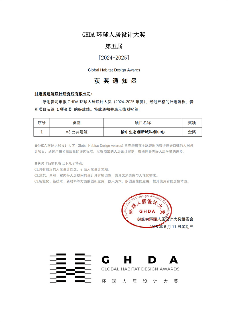 近日,備受矚目的第五屆GHDA環(huán)球人居設(shè)計(jì)大獎(jiǎng)獲獎(jiǎng)名單揭曉。甘肅工程咨詢集團(tuán)旗下省建筑設(shè)計(jì)院精心打造的榆中生態(tài)創(chuàng)新城科創(chuàng)中心項(xiàng)目,繼榮獲美國綠色建筑委員會(huì)頒發(fā)的LEED V4 BD+C鉑金級(jí)預(yù)認(rèn)證、中國綠色建筑三星級(jí)預(yù)評(píng)價(jià)兩項(xiàng)權(quán)威認(rèn)證后,再度摘得公共建筑類金獎(jiǎng),彰顯出我省在人居設(shè)計(jì)領(lǐng)域的卓越實(shí)力。