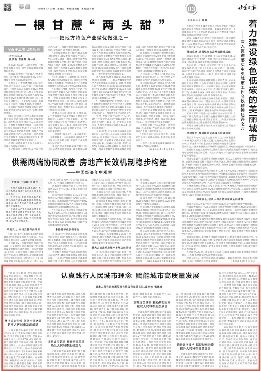 7月14日至15日,中央城市工作會議在北京舉行。這是時隔十年,黨中央再次召開的城市工作會議,為新時代新征程城市工作指明方向。甘肅工程咨詢集團深入學習貫徹習近平總書記關于城市工作的重要論述,全面落實中央城市工作會議精神,認真踐行人民城市理念,立足區域發展實際,將集團公司七十余年技術積淀轉化為服務人民需求的實踐動能,在優化城市空間格局、提升城市功能品質、推動綠色低碳轉型、賦能智慧高效治理等領域精耕細作,助推全省城市建設向著高度與溫度并存、發展與惠民同步的方向邁進。