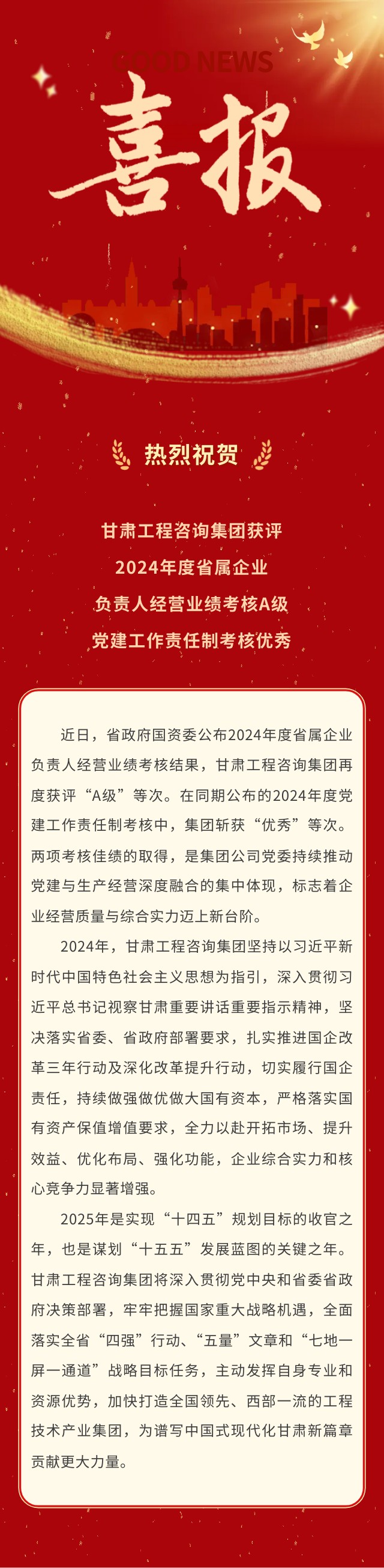 喜報 | 甘肅工程咨詢集團(tuán)榮獲2024年度省屬企業(yè)考核“雙優(yōu)”佳績:經(jīng)營業(yè)績考核A級、黨建工作責(zé)任制考核優(yōu)秀