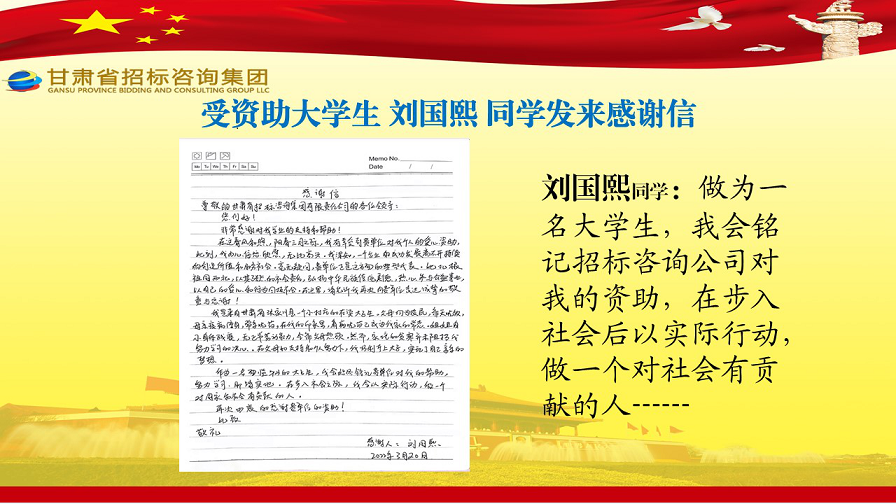 近日,張家川縣張棉驛鄉張棉村貧困大學生代表劉國熙、周長斌、李雪峰等向甘肅省招標咨詢集團有限責任公司發來感謝信,就招標咨詢集團給予學費資助一事表達他們的感激之情。