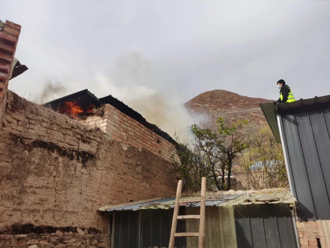 10月30日下午3點,交通監(jiān)理公司負責幫扶的臨潭縣洮濱鎮(zhèn)馬旦溝村一戶村民家中突然冒出滾滾濃煙,火光在濃煙中忽隱忽現。著火是一座磚木結構彩鋼屋頂的新房,火從屋頂燒起,越燒越旺。著火的房屋旁邊堆放著多年的老柴火,干燥異常,一絲火星就能點燃,而與著火點緊鄰著的就是布局緊密的鄉(xiāng)親們的房屋,再往外圍則緊接著山林,如果火勢蔓延,后果將不堪設想。
