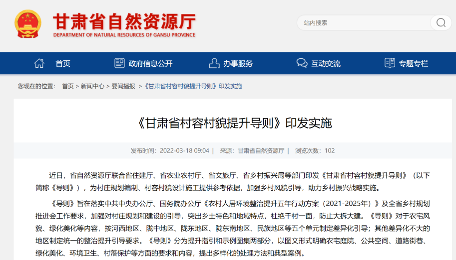 為進一步貫徹落實中共中央辦公廳、國務院辦公廳《農村人居環境整治提升五年行動方案(2021—2025年)》及全省鄉村規劃推進會精神,由甘肅省城鄉規劃設計研究院有限公司牽頭,聯合甘肅省建筑設計研究院有限公司、西北師范大學城市規劃與旅游景觀設計研究院編制的《甘肅省村容村貌提升導則(試行)》(以下簡稱《導則》),于3月18日由省自然資源廳、省住建廳、省農業農村廳、省文旅廳、省鄉村振興局等五部門聯合印發。《導則》的發布為全省村莊規劃編制工作提供了參考依據,是推進鄉村振興戰略實施的重要抓手,是改善我省農村人居環境、建設美麗甘肅的核心引導,將在規范我省村容村貌提升、弘揚傳統文化、突出鄉土特色和地域特點,杜絕千村一面,防止大拆大建等方面發揮重要作用。