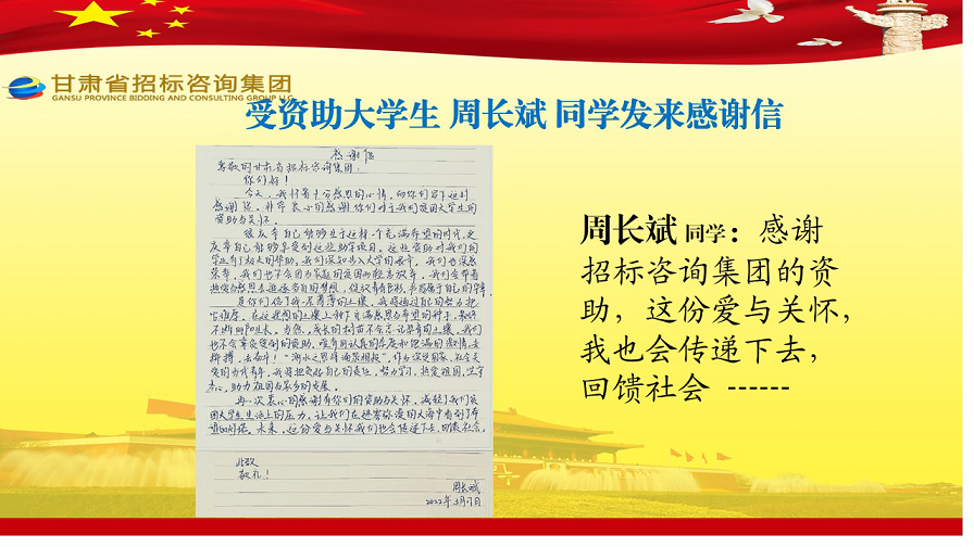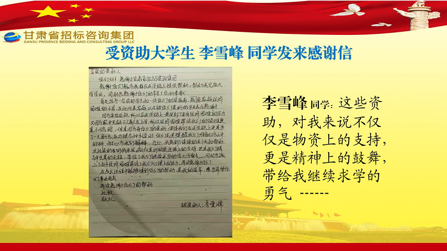 近日,張家川縣張棉驛鄉張棉村貧困大學生代表劉國熙、周長斌、李雪峰等向甘肅省招標咨詢集團有限責任公司發來感謝信,就招標咨詢集團給予學費資助一事表達他們的感激之情。