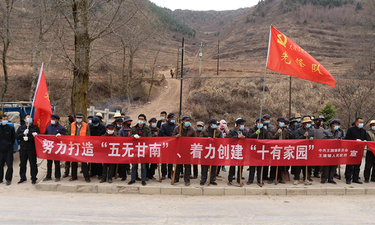 2022年4月,根據王旗鎮安排,駐村幫扶工作隊員會同其他鎮村干部組織群眾數十人,在洮河西岸磨溝段開展了以“黨旗高擎、黨徽常耀、綠色出行、保護環境”為主題的義務植樹活動,共栽下4000余棵松樹苗,掀起了植樹造林的熱潮。