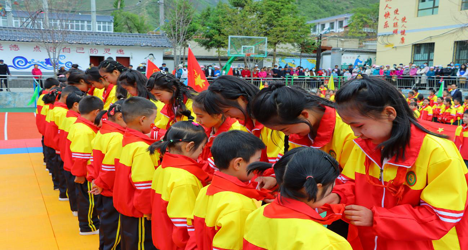 活動(dòng)現(xiàn)場(chǎng),在莊嚴(yán)激昂的國歌聲中舉行了升國旗儀式。簡(jiǎn)單而又隆重的入隊(duì)儀式上,鮮紅的隊(duì)旗迎風(fēng)飄揚(yáng),隨著入隊(duì)隊(duì)員名單的宣布,許多一年級(jí)的同學(xué)成為了光榮的中國少年先鋒隊(duì)隊(duì)員,并由高年級(jí)的少先隊(duì)員為他們戴上了鮮艷的紅領(lǐng)巾。隨后,大隊(duì)輔導(dǎo)員帶領(lǐng)新隊(duì)員宣誓,響亮的呼號(hào)聲“時(shí)刻準(zhǔn)備著”響徹校園上空,集中展示了新時(shí)代少先隊(duì)員積極向上的精神風(fēng)貌,全體師生為他們送上最深的祝福。最后,新隊(duì)員代表發(fā)言,標(biāo)準(zhǔn)的隊(duì)禮、堅(jiān)定的眼神、稚嫩的聲音表達(dá)了最大的決心,號(hào)召全體新隊(duì)員要在星星火炬的指引下刻苦讀書,從小聽黨話、感黨恩、跟黨走,努力成長(zhǎng)為中國特色社會(huì)主義事業(yè)建設(shè)者和接班人。