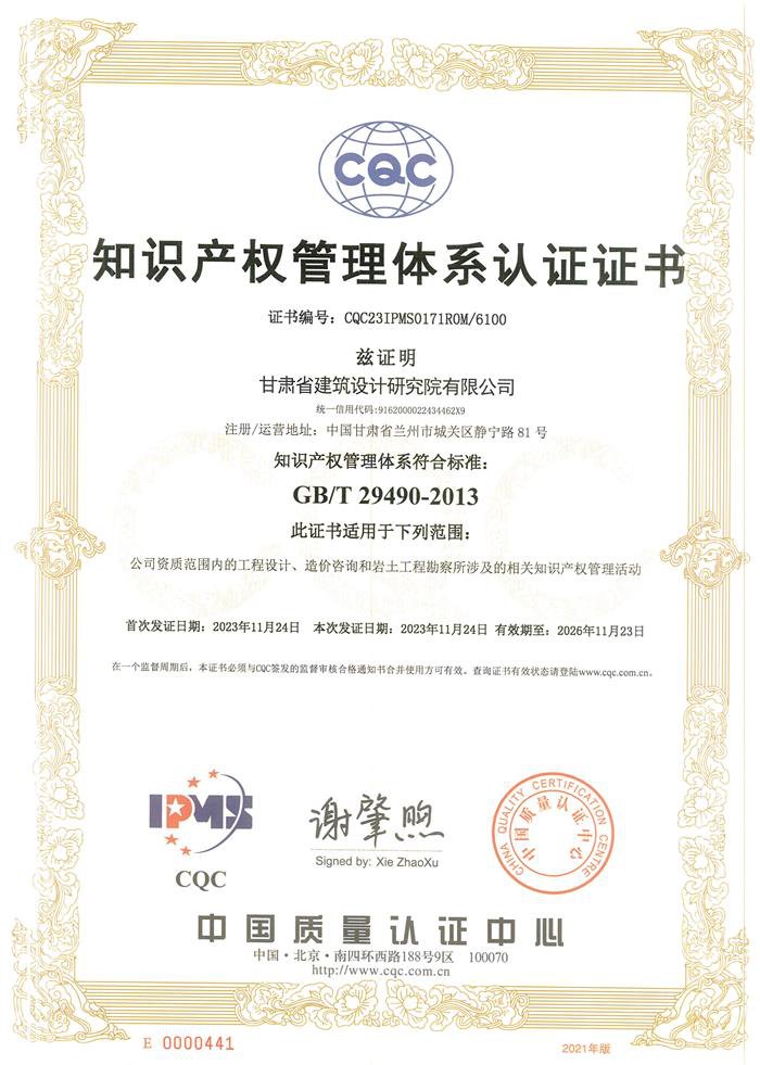 近日,省建筑設(shè)計(jì)院收到由中國(guó)質(zhì)量認(rèn)證中心頒發(fā)的編號(hào)為CQC23IPMS0171ROM/6100的《知識(shí)產(chǎn)權(quán)管理體系認(rèn)證證書(shū)》,標(biāo)志著省建筑設(shè)計(jì)院知識(shí)產(chǎn)權(quán)管理體系完全符合GB/T 29490-2013標(biāo)準(zhǔn),這是省建筑設(shè)計(jì)院在國(guó)家層面知識(shí)產(chǎn)權(quán)領(lǐng)域取得的重要認(rèn)可,進(jìn)一步提升了省建筑設(shè)計(jì)院的綜合競(jìng)爭(zhēng)力。