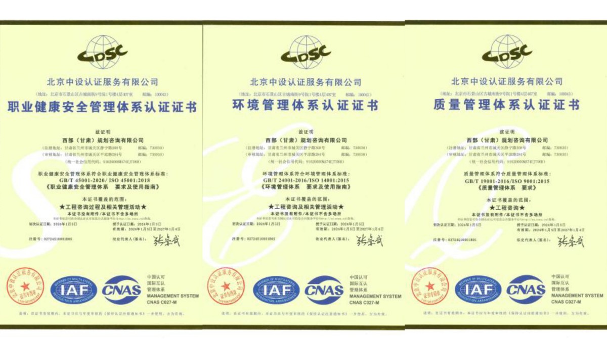 近日,經北京中設認證服務有限公司評審,西部(甘肅)規劃咨詢有限公司順利通過ISO9001質量管理體系、ISO14001環境管理體系、ISO45001職業健康安全管理體系認證并取得證書。
