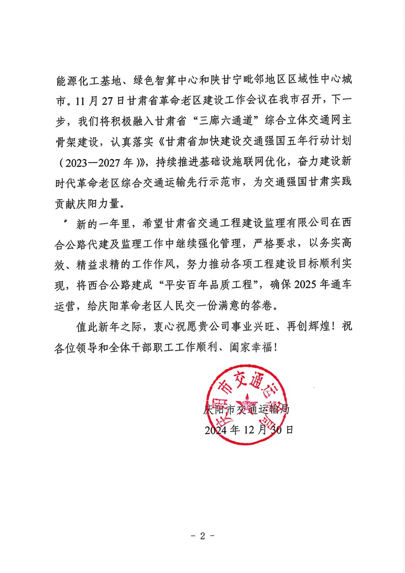 12月30日,甘肅工程咨詢集團收到慶陽市交通運輸局的感謝信,向省交通監理公司在G309線合水(老城)至西峰段公路項目建設過程中作出的貢獻表示感謝。