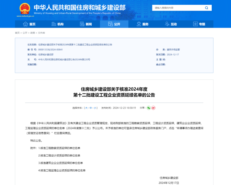 近日,住房城鄉(xiāng)建設部正式發(fā)布了《關于核準2024年度第十二批建設工程企業(yè)資質延續(xù)名單的公告》。省建筑設計院建筑行業(yè)甲級、風景園林工程設計專項甲級、市政行業(yè)(給水工程)專業(yè)甲級、市政行業(yè)(熱力工程)專業(yè)甲級資質通過核準延續(xù)。